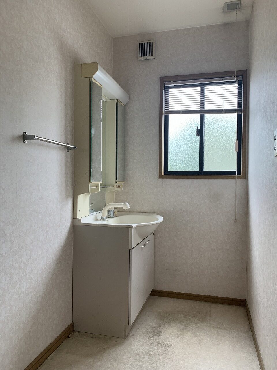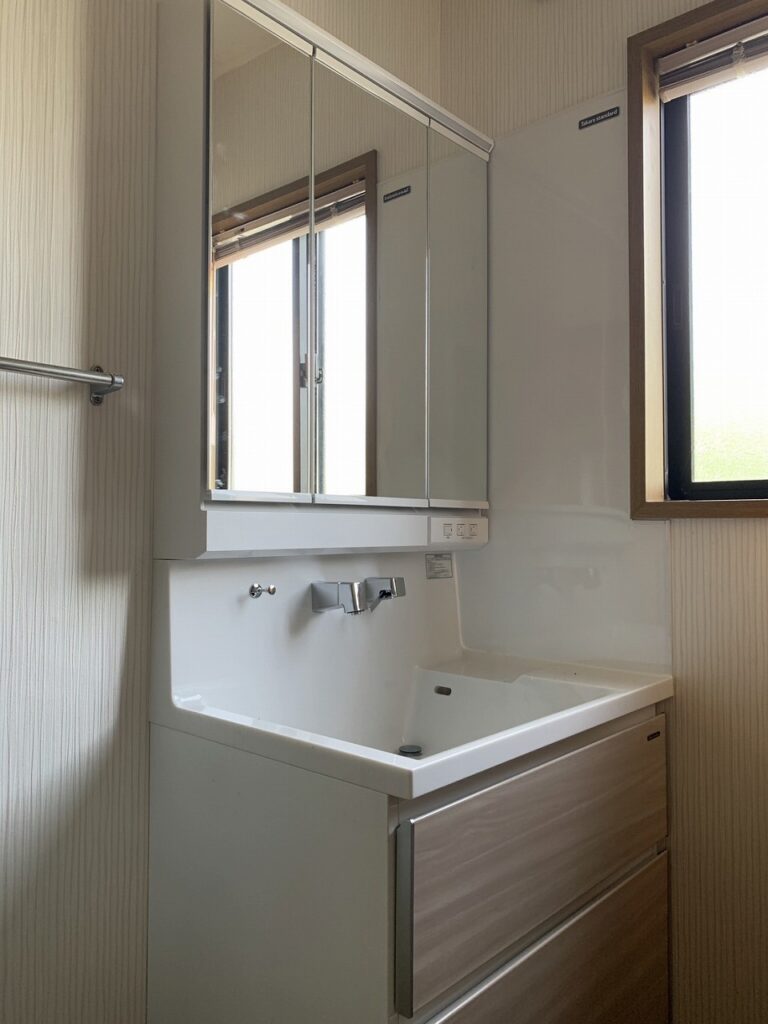 洗面化粧台と壁紙、床クッションフロアの張替えをしました。洗面化粧台は水栓をエコハンドル仕様にして無駄なお湯の使用を防ぐものに。