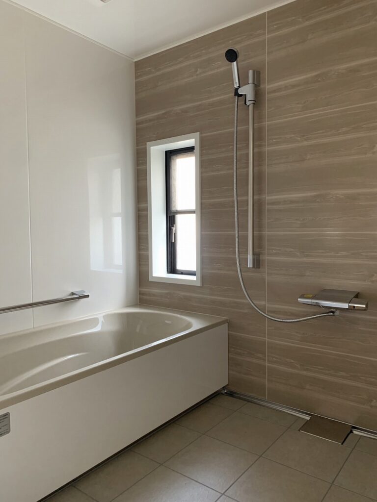 完成した浴室は、ベージュ基調の温かい雰囲気の空間。床はタイルですが、断熱材が敷きこまれ、温かく掃除のしやすい素材になっています。